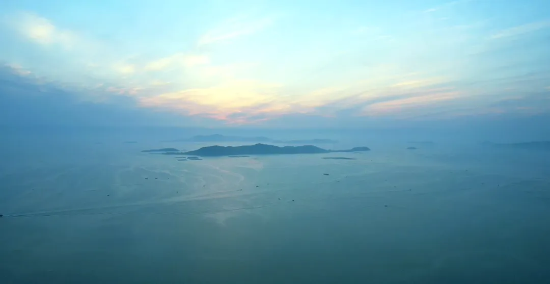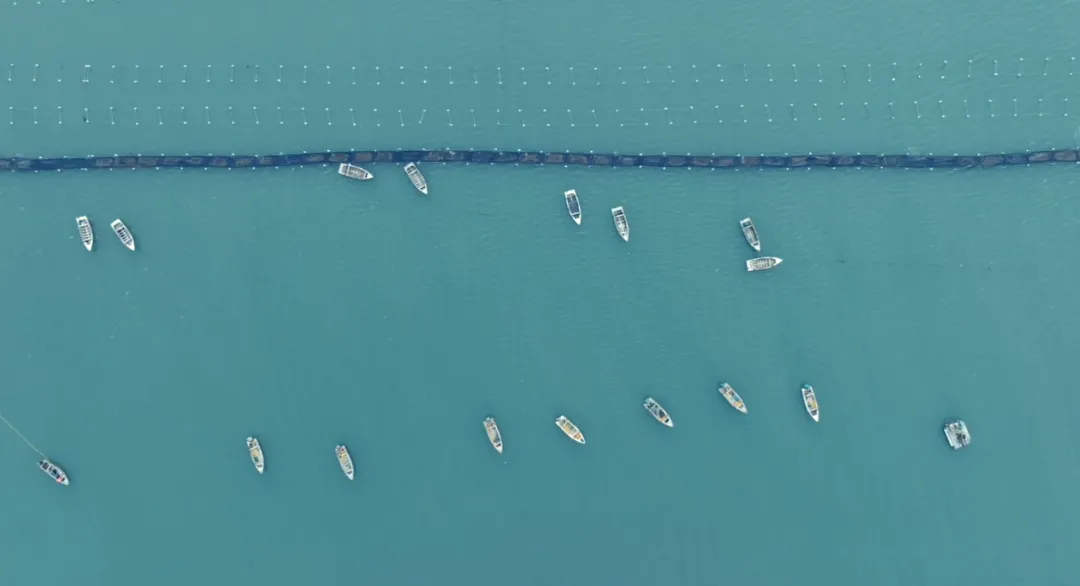眺望浩瀚的天海灣,遼闊的海面被一道道大壩分成了井字狀,在大海圍欄上,256個智能換水口每天利用潮汐的自然力量讓新鮮海水自由流動,在整個海域中,只投苗、不投餌,海參完全靠吸收大海的天然精華成長。