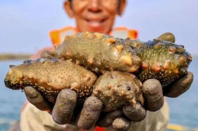 拿起一只,飽滿誘人比手掌還大肥美Q彈的天然有機刺參在海邊湛藍的天空下,泛出“誘人”的光澤。