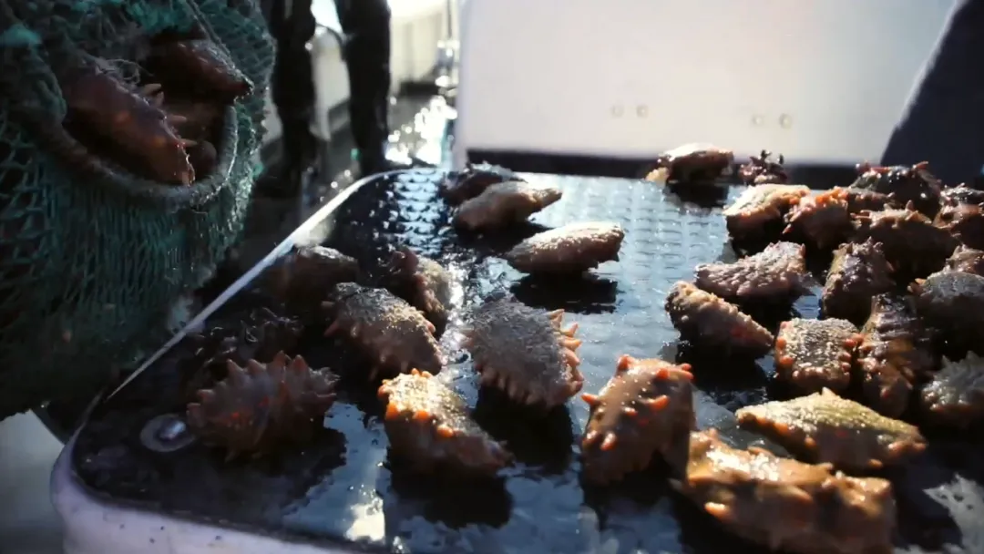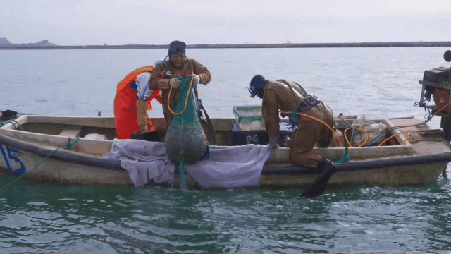 “海猛子”們在海面下忙碌地進行海參捕撈以供應各地市場,一兜兜鮮活的海參陸續被捕撈上船。